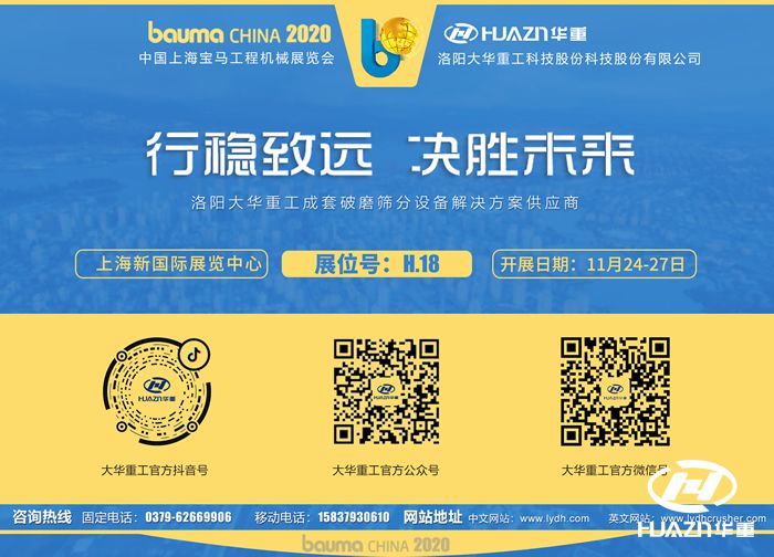 bauma CHINA 2020(上海寶馬展)將于2020年11月24-27日如期舉辦,歡迎大家前來咨詢了解制砂生產(chǎn)線,洛陽大華重工在上海新國際博覽中心H.18靜候您的光臨!