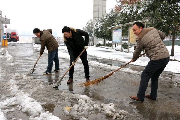 同事們不畏嚴寒,積極主動、相互配合、齊心協力,冒著凜冽的寒風,清掃著冰雪的路面,許多人的手和臉都被凍得通紅,鞋子也被浸透,然而,這一切絲毫沒有影響大家的勞動熱情,他們團結協作,掃的掃、鏟的鏟井然有序的干的熱火朝天,經過一個多小時的奮戰,公司辦公樓、車子棚及各車間通道都被打通,確保員工出行和樹木安全。