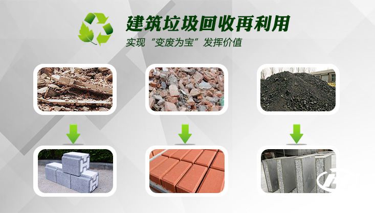 廢棄物經分揀、剔除或粉碎后,大多可以作為再生資源重新利用如:廢鋼筋、廢鐵絲、廢電線和各種廢鋼配件等金屬,經分揀、集中、重新回爐后,可以再加工制造成各種規格的鋼材;廢竹木材則可以用于制造人造木材;磚、石、混凝土等廢料經粉碎后,可以代砂,用于砌筑砂漿、抹灰砂漿、打混凝土墊層等,還可以用于制作砌塊、鋪道磚、花格磚等建材制品。
