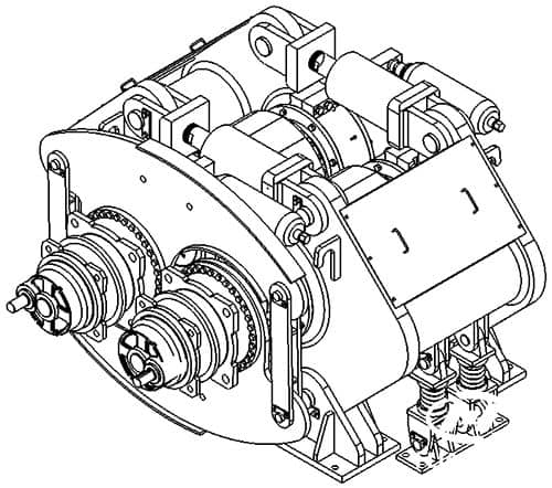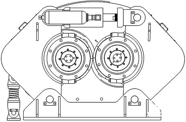 設(shè)計開發(fā)了“扭力支撐臂”結(jié)構(gòu),利用兩減速機(jī)自身扭矩方向相反而相互抵消的特點(diǎn),減少了以往輥壓機(jī)對地基高耐力的要求,同時自身結(jié)構(gòu)緊湊,節(jié)約占地空間。