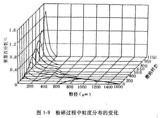 為此海伍德(Hey—wood)在一個小磨機中做研磨煤的一系列實驗,其結(jié)果如圖1—9所示。其中產(chǎn)品顆粒粒度的分布以磨機累積轉(zhuǎn)數(shù)的函數(shù)表示。原始的粒度分布顯示小一個單峰型,它相當于比較粗的顆粒。當粉碎比逐步增加時,這峰型就逐漸減小并且在一特定的粒度產(chǎn)生第二個峰型。這過程一直進行到第一個峰型完全消失時為止。第二個峰型是物料的特征,稱為持久峰型,而第一個蜂型稱為暫時峰型。
