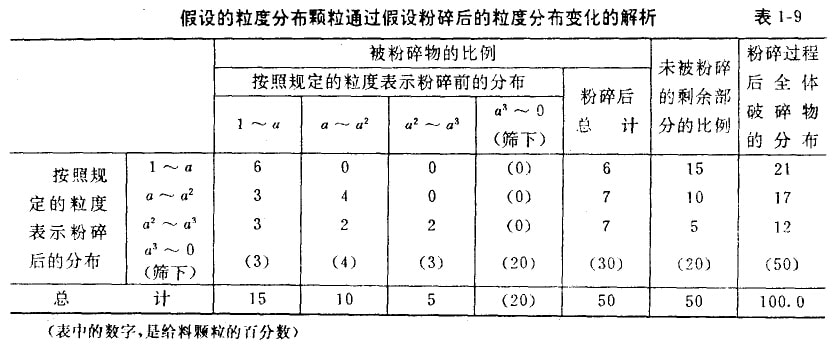 由表1—9可見,粉碎后總計欄表示受粉碎作用的粒子粉碎后的分布。如加上未受粉碎作用的部分,則可得最后一列所示的粉碎后全部粒子的分布,即粉碎作用產生了{30 20 10}—{21 17 12}粒度分布的變化。