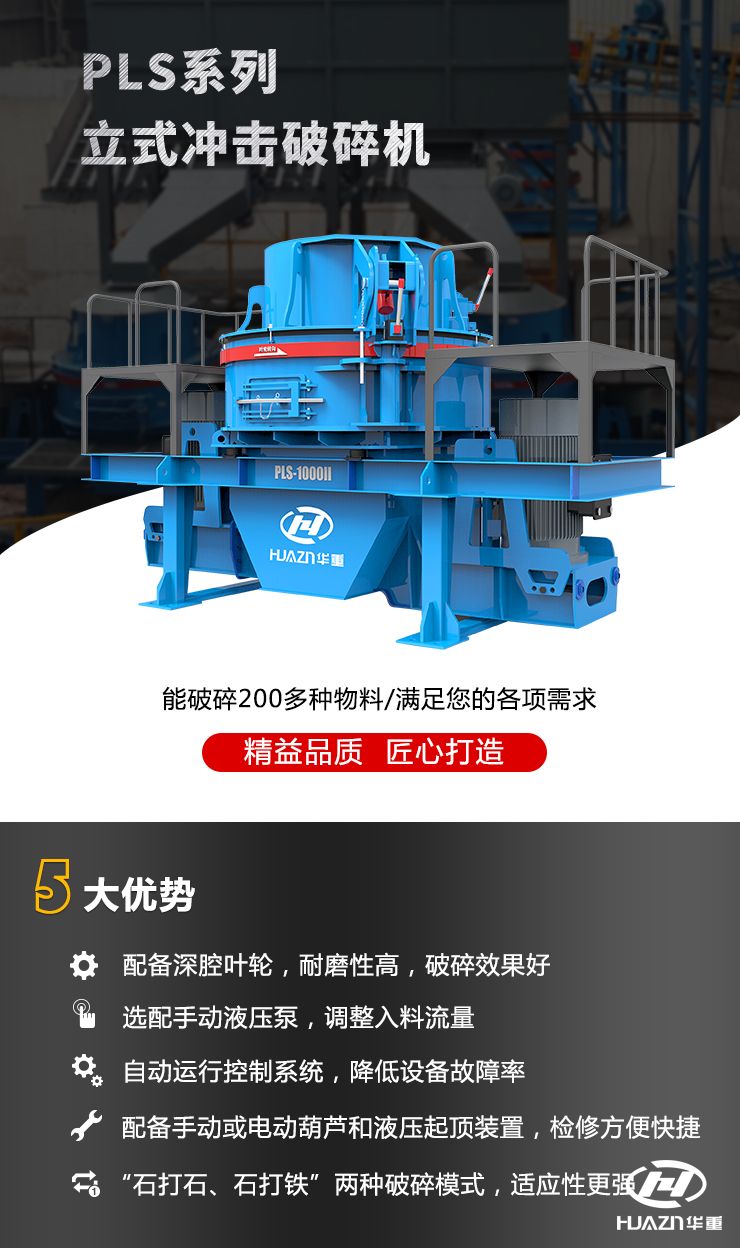 PLS系列立式沖擊破碎機可采用80米/秒以上的高轉速模式,用于砂石骨料加工行業粗砂粒的再次細碎整形,從而起到優化調整成品砂粒度級配的作用,使砂子的細度模數可以更小。
