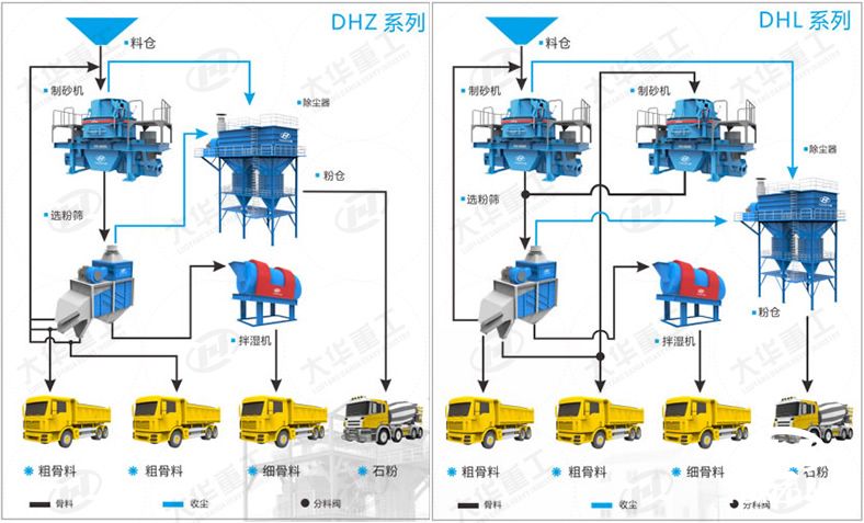 DHZ系列平面站式制砂生產線,結構簡單,可靠耐用,生產效率高。生產的精品機制砂粒型圓整、顆粒級配連續、細度模數可調,該生產線采用多點集中除塵,有效控制粉塵排放。