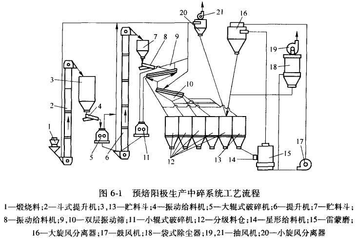 陽(yáng)極廠原料的破碎,一般分為3—4個(gè)級(jí)別:粗碎是將200mm左右的大塊破碎至50—70mm中塊;中碎是將50mm左右的小塊破碎至1—20mm的粒子;磨粉是將lmm左右的粒子磨到0.075mm左右的細(xì)粉。