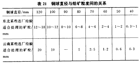 許多選礦廠出于省事,而且對鋼球尺寸在粗磨礦中所起的作用認識不足,磨機裝球直接參照一些書中所列出的經驗球徑(表21所示)。表中的球徑值與表19所列的國外選礦廠粗磨球徑相比,這些經驗球徑明顯是偏大的。主要原因在于這些經驗球徑來源于五六十年代選廠磨礦實踐,而當時的磨機直後均較小,只能以鋼球重量來彌補勢能的不足。而現在選廠多采用大直徑磨機,所以直接采用經驗球徑誤差也是較大的。