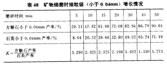 (8)隨粒度變細(xì),各種礦物的選擇性破碎現(xiàn)象減弱。隨顆粒粒度的變細(xì),礦物強(qiáng)度增加,軟硬礦物的磨碎速度開始趨于一致, 表48的數(shù)據(jù)已說明此點(diǎn),K值隨磨礦時(shí)間的延長逐漸趨向于1。 表54所示為選擇性磨碎現(xiàn)象與磨碎時(shí)間的關(guān)系。結(jié)果說明:隨磨礦時(shí)間的延長,礦物顆粒變細(xì),軟硬兩種礦物的平均粒度差變小,磨碎時(shí)間足夠長時(shí),二者粒度可達(dá)到相同;軟硬兩種礦物小于0. 074mm產(chǎn)率差隨磨礦時(shí)間的延長而減少,而且時(shí)間愈長產(chǎn)率差值愈小,即粗磨下選擇性磨碎現(xiàn)象顯著,而細(xì)磨下選擇性磨碎現(xiàn)象逐漸減弱。造成這一現(xiàn)象的原因是礦物隨粒度減小強(qiáng)度增大,礦物之間強(qiáng)度差縮小,選擇性磨碎現(xiàn)象減弱。