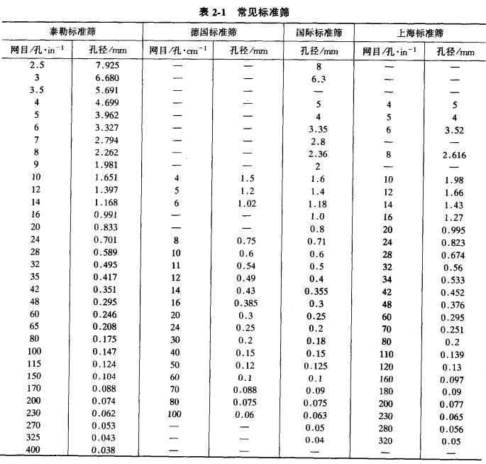 此外,還有英國B.S系列標(biāo)準(zhǔn)篩。我國標(biāo)準(zhǔn)篩的篩制尚未公布,常用的上海篩類似泰勒篩。 各種標(biāo)準(zhǔn)篩見表2-1,我國常用的上海篩也列入表中以供參考。