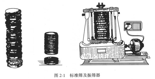 標(biāo)準(zhǔn)篩的篩框是圓形的,用塑料或黃銅制成,直徑在150~450mm之間,深度為25~50mm, 篩網(wǎng)用金屬絲編制而成,篩孔大的也有用沖孔篩板的。篩析所用的標(biāo)準(zhǔn)篩及震篩器如圖2-1所示。