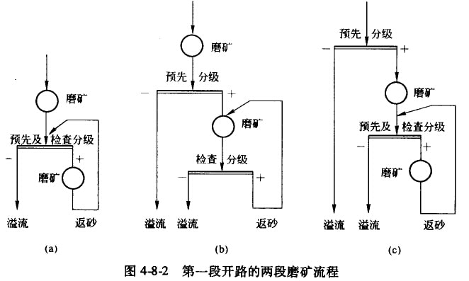 圖4-8-3中流程(a)和(b)的區(qū)別僅在于第二段的分組,前者的預(yù)先分級(jí)和檢查分級(jí)是合并的,后者是分開(kāi)的。采用流程(b)時(shí),原生礦泥和礦石中的易碎部分不再進(jìn)入第二段的檢查分級(jí)機(jī),對(duì)于產(chǎn)生次生礦泥的礦石,第二段分級(jí)機(jī)的工作可能不穩(wěn)定,因而會(huì)降低分級(jí)效率。采用流程(a)時(shí),當(dāng)破碎車間的最終產(chǎn)物粒度減小時(shí),磨礦機(jī)的生產(chǎn)能力會(huì)有所增加,這時(shí)分級(jí)機(jī)可能成為磨礦車間的薄弱環(huán)節(jié)。在這種情況下,可以改用流程(b),或安裝補(bǔ)充的中間分級(jí)機(jī)。