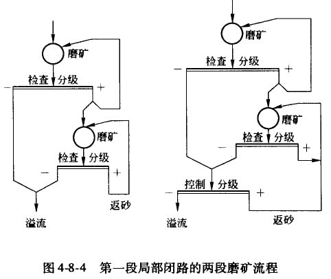 為了得到較細(xì)的磨礦產(chǎn)物以及需要進(jìn)行階段選別時(shí),經(jīng)常采用兩段磨礦流程。進(jìn)行階段選別時(shí),第一磨礦段的產(chǎn)物進(jìn)入第一段選別,選得精礦,其尾礦或中礦(有時(shí)可能是混合精礦或粗精礦)經(jīng)第二段磨礦后,再進(jìn)入第二段選別。