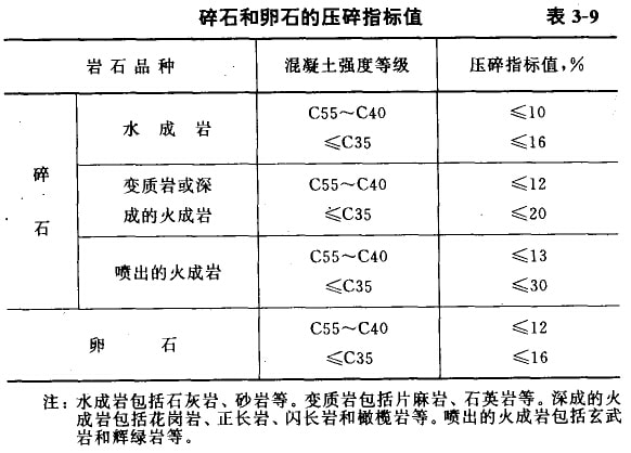 碎石或卵石須具有足夠的強度,以保證混凝土的強度要求。碎石的強度可用巖石的抗壓強度和壓碎指標值表示。巖石的抗壓強度與混凝土強度等級之比不應小于1.5,且火成巖強度不宜低于80MPa,變質(zhì)巖不宜低于60MPa,水成巖不宜低于30MPa。混凝土強度等級為C60及C60以上時應進行巖石抗壓強度檢驗,其他情況下如有懷疑或認為有必要時,也可進行抗壓強度試驗。巖石的抗壓強度首先應由碎石生產(chǎn)供應單位提供檢驗報告。工程中經(jīng)常性的質(zhì)量控制,可用壓碎指標值檢驗控制碎石的強度,碎石的壓碎指標值宜符合表3-9的規(guī)定。