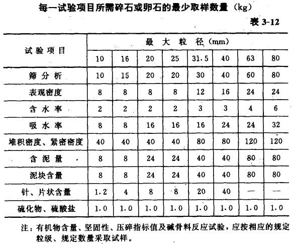 每一單項試驗的試祥應不少于表3-12所規(guī)定的最小取樣數(shù)量。須作兒項試驗時,如確能保證試樣經(jīng)一項試驗后不致影響另一項的試驗結果,可用同一批試樣進行幾項不同的試驗。