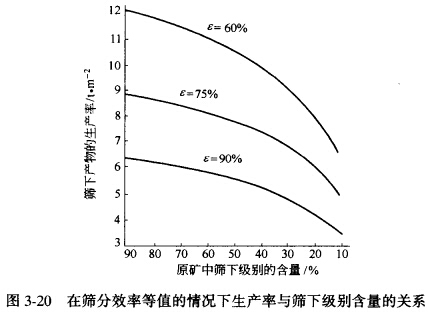 被篩物料的粒度組成,對(duì)于篩分過(guò)程有決定性的影響,在任何情況下,細(xì)粒總是比粗粒容易通過(guò)篩孔。因此,當(dāng)物料中細(xì)級(jí)別含量增大時(shí),篩子的生產(chǎn)率也隨之顯著增大。圖3-20所示曲線表示不同篩分效率時(shí)的生產(chǎn)率(按篩下產(chǎn)物計(jì)算)與原料中細(xì)粒級(jí)含量之間的關(guān)系。由圖可以看出,當(dāng)原物料中篩下級(jí)別的含量由10%增加到90%時(shí),篩子的生產(chǎn)率幾乎增大一倍。這是因?yàn)椋?dāng)篩下級(jí)別含量大的物料給入篩面時(shí),細(xì)粒很迅速地通過(guò)篩孔,而留在篩上的物料就很少了, 此時(shí),即使在篩上物料中還有一些"難篩粒",相對(duì)地比較容易通過(guò)篩孔,因?yàn)槠渌V粒對(duì)它們的影響小。反之,當(dāng)原物料中篩下級(jí)別含量少時(shí),因?yàn)檎麄(gè)篩面幾乎被篩上產(chǎn)物所占據(jù),妨礙了細(xì)粒通過(guò)篩孔,因此,在保證篩分效率相等的條件下,按給礦量計(jì)算的生產(chǎn)率也就降低了;所以當(dāng)原物料中細(xì)級(jí)別含量少,而粗級(jí)別的粒度又比篩孔尺寸大得多的時(shí)候,為了提高篩子的生產(chǎn)能力和延長(zhǎng)篩網(wǎng)的使用壽命,可以采用增加輔助篩網(wǎng)的方法,用篩孔尺寸較大的輔助篩網(wǎng),預(yù)先篩除篩上產(chǎn)物過(guò)粗的級(jí)別,然后用下層篩網(wǎng)對(duì)含有大量細(xì)級(jí)別的物料進(jìn)行最終篩分,此時(shí),雙層篩作單 層篩使用,只接兩個(gè)產(chǎn)品。