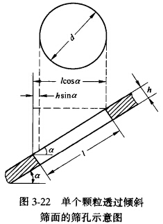 一般情況下,篩子是傾斜安裝的,以便于排出篩上物料。傾角大小要合適,傾角過(guò)小,物料在篩面上運(yùn)動(dòng)速度太慢,雖然篩分效率高,但篩子的生產(chǎn)率減。环粗,傾角太大,物料排出太快,篩分效率降低。當(dāng)篩面傾斜安裝時(shí),可以讓顆粒順利通過(guò)的篩孔尺寸只相當(dāng)于篩孔的水平投影,如圖3-22所示。能夠無(wú)阻礙地透過(guò)篩孔的顆粒直徑等于d = Icosa - hsina,式中I為篩孔尺寸,h為篩面厚度,a為篩子的傾角。由此可見(jiàn),篩面的傾角愈大, 使顆粒通過(guò)時(shí)受到的阻礙愈大。因此,篩面的傾角要適當(dāng)。表3-9所示為篩面的傾角與篩下物最大粒度及篩孔尺寸的關(guān)系。