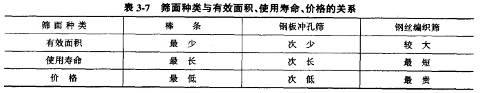 篩子的工作面通常有三種:鋼棒(或條)制造、鋼板沖孔和鋼絲編織。它們對(duì)篩分過(guò)程的影響,主要和它們的有效面積有關(guān),見(jiàn)表3-7。
