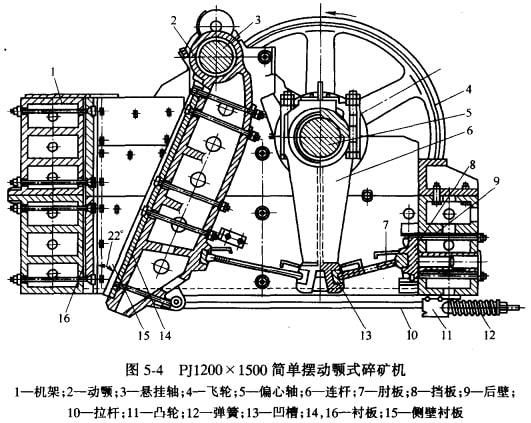 圖5-4是我國生產的PJ1200X 1500簡單擺動顎式破碎的剖視圖。這種碎礦機主要是由機架和支承裝置,碎礦的工作機構,傳動機構,保險裝置及排礦口調整裝置等幾部分組成。