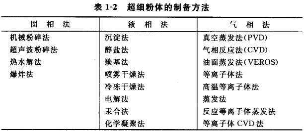 因為超細粉體具有優良的性能和廣泛的用途,所以人們研制了許多的制備方法。主要制備方法見表1-2。