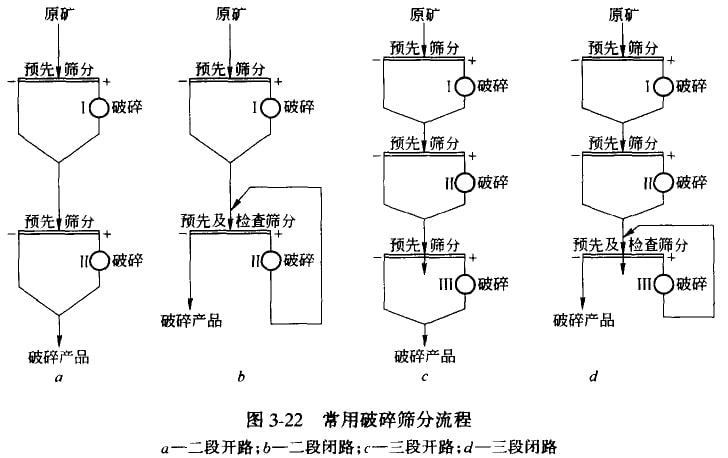 圖3-22a和b分別為二段開(kāi)路和二段閉路流程。二段開(kāi)路破碎篩分流程優(yōu)點(diǎn)是較經(jīng)濟(jì),缺點(diǎn)是難保證產(chǎn)品粒度。二段閉路破碎篩分流程能保證產(chǎn)品粒度要求,但成本較前者高。二段破碎篩分流程總破碎比不大,生產(chǎn)能力一般小于100t/d。