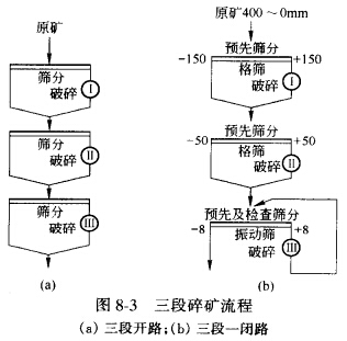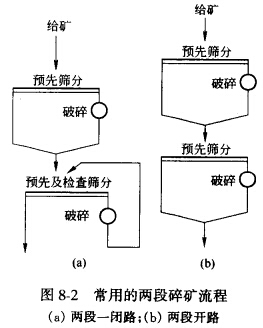 當(dāng)選礦廠生產(chǎn)規(guī)模不大,且第一段碎礦機(jī)生產(chǎn)能力有富余時,第一段可不設(shè)預(yù)先篩分,即選用第一段不設(shè)預(yù)先篩分的兩段一閉路碎礦流程。而兩段開路碎礦流程,只有在某些重力選礦廠將碎礦產(chǎn)物直接送到棒磨機(jī)進(jìn)行磨礦時才采用。
