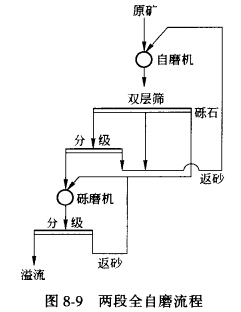 兩段全自磨流程是指第一段用自磨機粗磨,第二段用礫磨機進行細磨的磨礦工藝,如圖8—9 所示。因礫磨機的磨礦介質(礫石)取自第一段自磨機,從實質上說它也算是礦石自磨。第一段自磨機可在閉路條件下工作,也可開路工作。而第二段則都采用閉路磨礦,礫磨機用的礫石可由破碎系統供給,也可由自磨機(開礫石窗)供給。