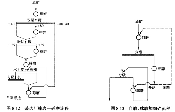 對于不適合于用自磨機組磨的硬度較大的礦石,可采用先將礦石破碎后再用棒磨機作為第 一段粗磨,從破碎產物中篩出部分礫石作為礫磨機介質進行第二段細磨的兩段半自磨流程,我國某銅礦選礦廠就是采用這種棒磨加礫磨流程的,如圖8—12所示,該廠處理的是含銅矽卡巖類型礦石,普氏硬度系數f=12—16,要求磨礦紉度為—200目占65%。實踐表明,這種流程對礦石的適應性較廣泛,礫石的大小和數量易控制,生產條件比較穩定,操作容易掌握。礫磨中的難磨粒級是通過間斷排出并送回棒磨機再磨的辦法來處理的。