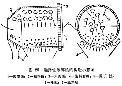 當原煤中的凈煤和矸石的硬度有一定差異時,往往采用選擇 性破碎機進行處理。這種選擇性破碎機又簡稱選碎機,因機身主體的形狀是用篩板做成的圓筒,內裝提升板,工作時轉動,故也 叫滾筒式破篩機(見圖25所示)。選碎機早在1904年已為選煤廠 所采用,日前在許多同家的選煤廠仍得到了普遍應用。
