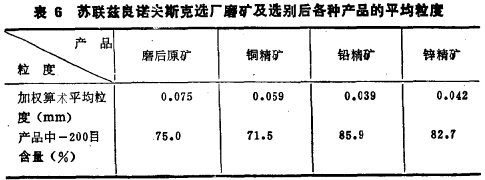 在生產實踐中,產品存在不同礦物粒子粒度差的例子也很多。廣西某沿鋅礦選廠磨礦及選礦產品的篩析計算結果列入表 5。從表l可以看出,硬度愈低的礦物粒度愈細,硬度愈高的礦物 粒度愈粗。蘇聯茲良諾夫斯克選礦廠處理多金屬硫化礦,磨后原礦及各種精礦也存在顯著的粒度差(表6)。