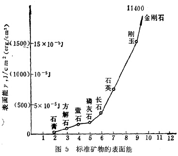 外力對晶體做功使晶體破壞,外力所做的功轉化為晶體的表而能,表面能愈大的晶體愈堅固,破壞時要對它做更大的功。莫氏硬度的10種標準礦物的表面能數(shù)值大小順序與這一結論相符 (見圖5)。
