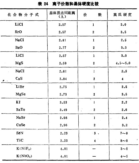此外,晶體的堅固程度還與它的構造形式有關。表23的數(shù)據說明:當其他條件類似時,質點間距離小的晶體硬度大,距離大的 硬度小。表24的數(shù)據說明,當質點間的距離相同時,原子價數(shù)髙的晶體硬度大,價數(shù)低的硬度小。此外,"根"或"基"原子團內部,引力較大時,晶體硬度也較大。