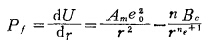 公式(2)右邊的第一項由引力造成,第二項由斥力造成。 曲線U表示結合能與質點距離的關系,在引力和斥力相等的位置處(r=r0處)結合能數(shù)值最小,這就是乎衡位置。增大或減小質點間的距離,都將導致結合能增大,這都需要外力對它作功。質點間的相互作用力P1等于結合能對距離的微分,即