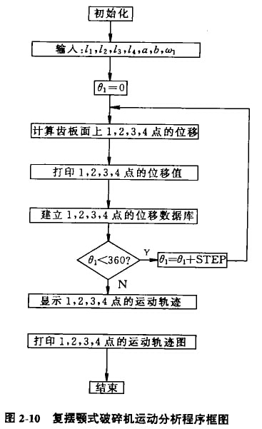 以600 x 900復(fù)擺領(lǐng)式破碎機為例進行計算機輔助分析。已知:l1=0.019m,l2=1.43m、l3=0.46m,l4=1.22m,w1=26.18s-1。為了簡化計算而又能說明問題,在動顎齒板面上任取四點.每點對應(yīng)的ai值分別為0.35m,0.78m,1.10m和1.43m,對應(yīng)的bi,值分別為0.445m,0.44m,0.437m和0.435m。當偏心軸轉(zhuǎn)一周,即θ1從O°變化到360°時,由式(2-3)—式(2-5)和已知條件可計算出齒板面上1—4點的位移并繪出相應(yīng)點的運動軌跡圖,其程序框如圖2-10所示。點的運動軌跡圖中,箭頭所在位置是θ1等于0°時點的起始位置,箭頭所指方向是點運動的方向。