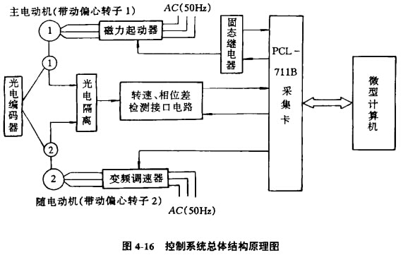 復合同步振動圓錐破碎機控制系統總體結構原理圖如圖4-16所示。該控制系統由兩臺相同規格型號的異步電機、電路的控制回路、電機的變頻調速裝置、一塊數據采集卡PCL-711B、一臺微型計算機、轉速檢測元件及電路等組成。因檢測系統和控制運算全部是數字量,所以屬于全數字控制系統。驅動兩個偏心轉子的兩臺交流異步電機,分別定義為主電機1和隨動電機2.控制隨動電機2使其跟蹤主電機1,實現跟蹤控制。主電機的啟動和停機由磁力驅動器控制,而磁力驅動器的交流控制回路由固態繼電器來控制。CL-711B板的DO2與固態繼電器的直流控制端聯接,D02為高電平時,驅動器接通,電機啟動,DO2為低電平時,驅動器斷開,電機停止,因此可通過軟件控制主電機啟動和停機。隨動電機由一臺高性能變頻調速器供電,變頻調速器的輸出控制方式是v/f為定值的正弦脈寬調制,并由低頻電壓補償.變頻調速器的輸出頻率由控制端的直流電壓確定,其電壓值等于PCL板D/A的輸出,所以通過調節D/A的輸出即可改變變頻調速器的輸出功率。兩臺光電編碼器分別安裝在兩臺電機的轉軸上,作為轉速的檢測元件,可同時檢測兩轉子間的相位差。FCL-711B是一塊多功能數據采集卡,直接插入微機的總線擴展槽內,并通過軟件控制,整個系統的開關量控制、狀態檢測及模擬量輸出均通過它完成。微機通過光電編碼器從兩臺電機轉軸上,接受經過檢測系統傳來的信號,并對這些信號進行運算處理,然后再通過數據傳輸通道向變頻調速器輸出控制電壓,實現對隨動電機的跟蹤控制,確保整個機械系統同步同相運轉,以提高新型振動圓錐破碎機的機械性能。
