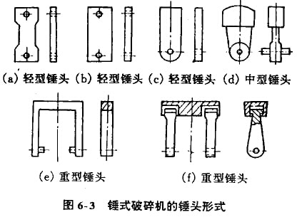 圖6-3中的(a),(b),(c)是輕型錘頭,質(zhì)量通常為3.5一15kg,多用來破碎粒度為100-200mm的軟質(zhì)相中等硬度物料,其中(a),(b)兩種兩端帶孔,磨損后可以調(diào)換4次使用,而(c)只能調(diào)換2次使用。圖6-3中的(d)為中型錘頭,質(zhì)量為30-60kg,用來破碎800mm-1000mm的中等硬度物料。圖6-3中的(e),(f)是重型錘頭,質(zhì)量達50-120kg,主要用來破碎大塊和堅硬物料。錘頭用高碳鋼鍛造或鑄造,也可用高錳鋼鑄造,為了提高耐磨性,采用高錳低合金鋼,有的在錘頭工作表面上涂焊上一層硬質(zhì)合金。近來有的用高鉻鑄鐵錘頭復(fù)合鑄造,即錘柄采用ZG45鋼,而錘頭采用高鉻鑄鐵,而耐磨性比高錳鋼錘頭提高數(shù)倍。