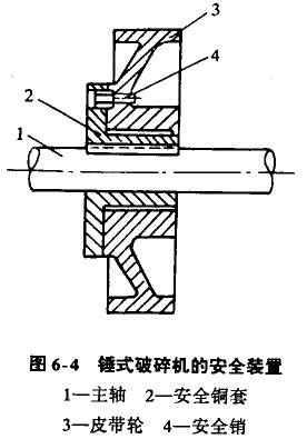 錘式破碎機的安全裝置如圖6-4所示。在破碎機的主軸上裝有安全銅套2,皮帶輪3套在銅套上,銅套與皮帶輪則用安全銷4連接,當(dāng)破碎機內(nèi)進入金屬物或過負荷時,安全銷即被剪斷而起保護作用。安全銷的材質(zhì)應(yīng)按規(guī)定或經(jīng)過實踐驗證,不能用強度過大的材料作安全銷,以防止進入金屬物后安全銷不斷裂,損壞其他零件和造成大的事故。