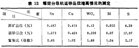 表33中列出某多金屬硫化礦在第一段磨礦分級機返砂中各種金屬礦物富集的情況。表33說明,磨碎錫石多金屬硫化礦時,各種金屬在分級機返砂中均有富集,尤以密度大的錫石、黑鎢礦更為突出,磁黃鐵礦也因粒度粗使富集比大。此外,對返砂中錫石的解離情況分析表明,其中游離的錫金屬率約占70%左右。性脆易碎的錫石,雖已基本單體解離,但還返入磨機藎復再磨,致使造成嚴重的錫石過磨及過粉碎。例如,某錫石硫化礦選廠的生產統計證明,第一段磨機由于磨礦分級循環中錫石高度富集所造成 錫金屬的過粉碎現象十分嚴重,過粉碎率約高達6~8%,即等于有6~8%的錫金屬因磨礦分級狀況不佳被損失了。