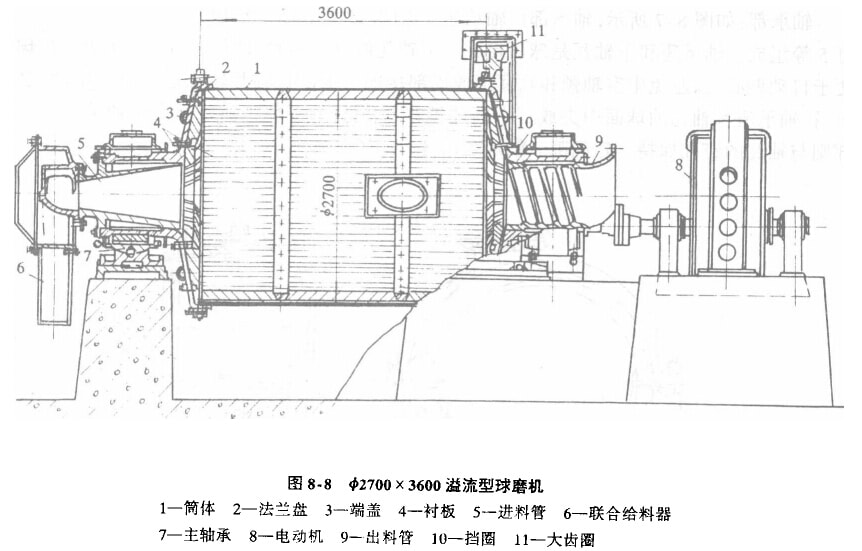 φ2700 x 3600溢流型球磨機的構造如圖8-8所示,除排料部與格子型球磨機構造不同外,其他部分基本相同。