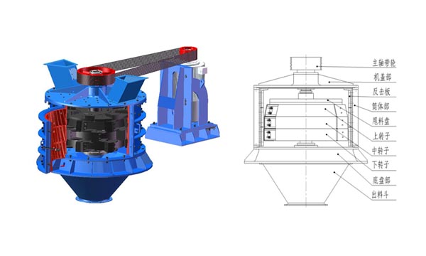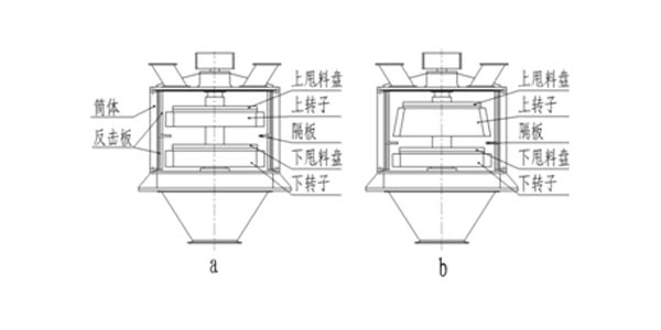 環形隔板或篦板的作用是:物料通過第一破碎腔破碎后,在環形隔板或篦板上自然形成堆積角,將物料導向下甩料盤,使其二次加速重復上一級的破碎過程。由于筒體高度的局限性,使上、下轉子間距較小,環形隔板或篦板距上轉子錘頭太近,不但形不成自然堆積角,反而經常引起堵料和上錘頭的過度磨損。