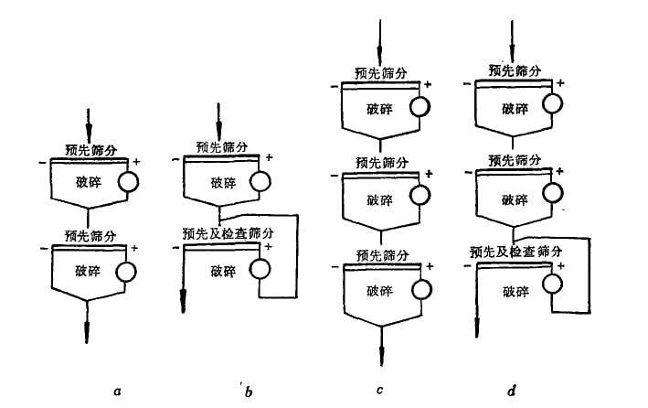 小型選礦廠常采用二段開路破種流程(圖1a),第一段一般可不設預先篩分。中小型選礦廠常用二段一次閉路破嬸流程(圖1b)成二段 —次閉路破碎流程(圖1d)。大型選礦廠常用三段開路破碎流程(圖lc)或三段一次閉路破碎她程(團1d)。在處理含水分較高的泥質礦 石及易產生大量石英礦塵的礦石時,以采用開路破碎流程為宜,因采用閉路破碎時,易使篩網及破碎機堵塞,或產生很多有害礦塵。