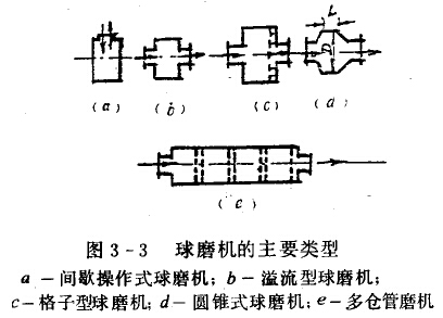 球磨機(jī)的主要類型如圖3-3所示。其共同點(diǎn)是都有一個(gè)水平放置的回轉(zhuǎn)筒體,差別在于筒體形狀、研解體形狀、操作方法、卸料方式、筒體文水方式、傳動(dòng)方式和生產(chǎn)特點(diǎn)等不同,而成為各種型式的球磨機(jī)。