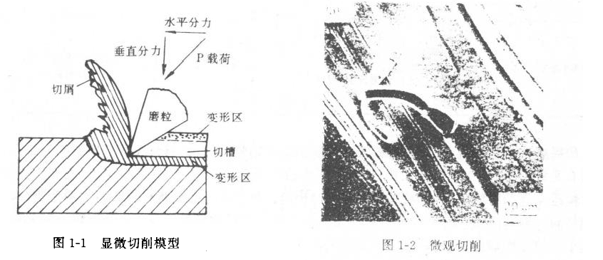 磨粒作用在金屬材料表面上,磨料上承受的就荷P可分為法向分力都切向分力。在法向分力作用下,磨料的棱角刺入材料表面,在切問分力作用下,磨粒沿平行于表面方向滑動,帶有銳利棱角并具有合適的迎角的磨粒能切削材料而形成切屑(見圖1-1)。圖1-2是一典型的磨粒切削材料而形成顯微切屑過程的照片?梢钥闯觯行既匀涣⒃诘嫔希谏哪チH匀昏偳对谇行嫉母。磨粒切削過程使材料表面產生某種校度的理性變形,圖1-2上還可以看到劃痕兩邊戲留的剪切皺折。這種切削過程與機加工過程產生的切屑極為相似,只是體積小些、故稱為微觀切削。