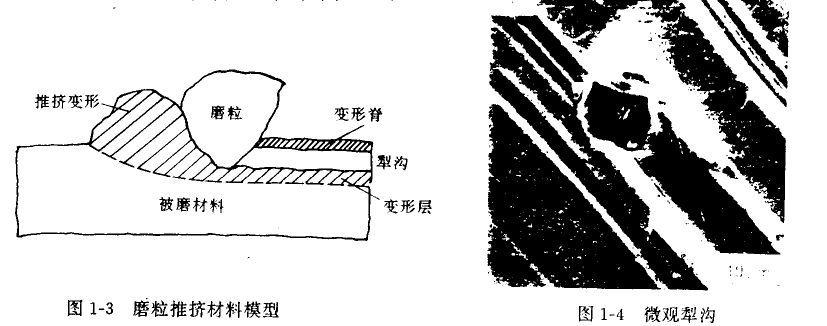 如果磨粒不夠尖銳,或刺入材料表面角度不適合切削,則會將材料表面擠出犁溝。犁溝變形有兩種:一種是由于磨粒推擠材料,使之堆積在廟版運動的前方,當堆積增高后就會阻礙磨粒運動直到磨粒破碎,或被其他磨粒破碎帶走。第二種是磨粒將材料擠向溝槽兩側(也可能擠向一側),圖l-3所示為帶有負前角的磨版推擠材料的模型。圖1-4是磨粒推擠材料形成犁溝的過程照片。磨粒犁溝材料表面并不能一次產生磨屑,而是當第一個磨粒推擠材料表面形成犁詢后,已經使溝榴底部或溝槽兩側金屆發生—“定程度的塑性變形,后繼的磨?赡芮邢鹘饘倩蚶^續推擠已經發生理性交形的犁溝構底或兩側,當磨粒多次使金屬變形且變形程度超過材料允許的延伸極限后,變形材料表面就會產生裂紋,裂紋擴展,形成薄片狀磨屑,這一磨損過程被稱為微觀犁溝(圖1-4)。