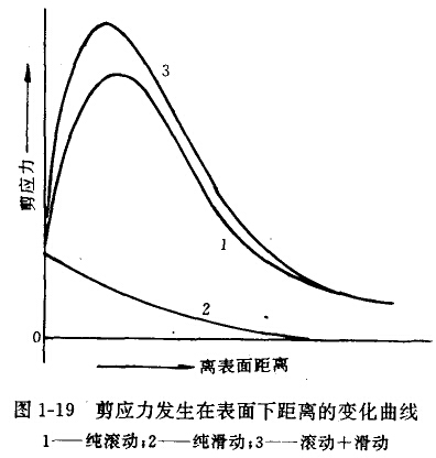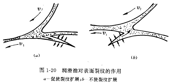 (1)裂紋起源于表面在滑動摩擦或滾動帶有滑動摩擦時,待別是當表面存有缺陷時,裂紋就容易從表面開始。例如兩齒輪在接觸過程中,表面不僅有交變接觸壓應力而且還有剪叨應力。根抓赫茲的理論,最大壓應力發生在表面上,而最大的剪應力發生在離表面一定距離處。圖1-19為剪應力發生在表面下距離變化曲線。在表面壓應力和剪應力反復作用一定周次之后,材料慶面就會產生局部的塑性變形相加工硬化,在漿些組織不均勻處,密易形成裂紋源,導致裂紋出現與擴散。當接觸表面存有潤滑油且滾動力。向與裂紋端部方向一致時.波動物體首先封住裂紋裂口處。(如圖1-20所示),裂紋中的潤滑油被培在裂縫小,在接觸歷應力作用下嚴生高壓油波,迫使裂紋向30°-45°角方向擴展。當裂紋向內表面擴展到一定深度都覽度時,裂紋上部如同一懸臂梁承受交變彎肋應力,最后因強度不足而折斷成金用磨屑,并留下麻點狀利落坑。