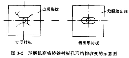 近幾年來,高格鑄鐵材料在耐磨零件中得到廣泛地應(yīng)用。盡管這種材料有很高的硬度和耐磨性,然而它比高錳鋼及低臺(tái)金鋼等材料要脆得多,如果結(jié)構(gòu)設(shè)計(jì)不當(dāng),往往出于開裂造成早期失效。比如高鉻鑄鐵制造的球磨機(jī)襯板,易由中間方孔四角裂紋擴(kuò)張開裂,后改為橢圓形孔,并注意安裝及使用條件,減少了應(yīng)力集中和開裂,使高鉻鑄鐵襯板,在球磨機(jī)中得到成功的應(yīng)用,如圖3-2所示。
