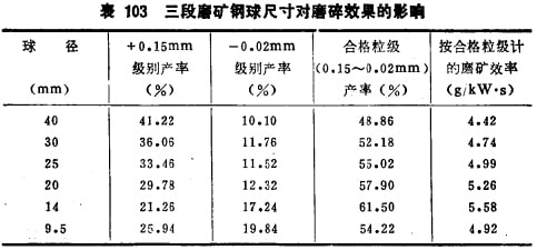 例如,用云錫公司卡房采選廠二段磨礦及三段磨礦給礦,通過(guò)試驗(yàn)方法確定它們的最適宜球徑:二段磨給曠的最大粒度1.2mm,要求的磨礦粒度0.3mm;三段磨給礦最大粒度0.7mm, 規(guī)定的磨礦粒度0.15mm;產(chǎn)品中-0.02mm級(jí)別算為過(guò)粉碎級(jí)表102及表103的試驗(yàn)結(jié)果說(shuō)明: