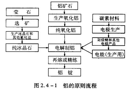 自1886年在冰晶石熔體中電解氧化鋁的方法實驗成功后,此法一直是生產金屬鋁的唯一方法。它包括從鋁礦石生產氧化鋁以及氧化鋁電解兩個主要過程。現代生產鋁的原則流程如圖2.4-1所示。