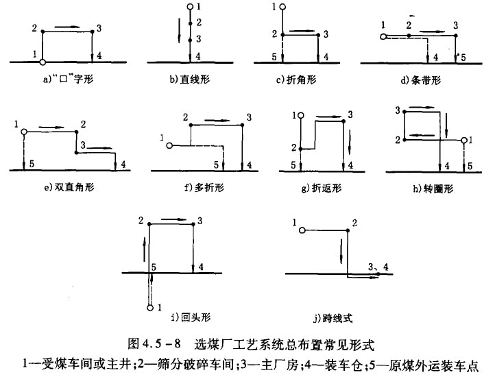 9)回頭形:為選煤廠布置在礦井鐵路站場異側時最常見之布置形式,與“口”字形有相仿之處。