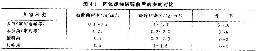 廢物經錘式破碎機破碎以后,由于尺寸減小而密度增加。幾種固體廢物破碎前后的密度結果列于表4-1。從表中可見,破碎處理可使廢物的密度增加2-10倍。