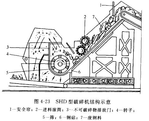 SHD型廢鋼破碎機結(jié)構(gòu)如圖4-23所示,功率與生產(chǎn)能力如表4-5所示。