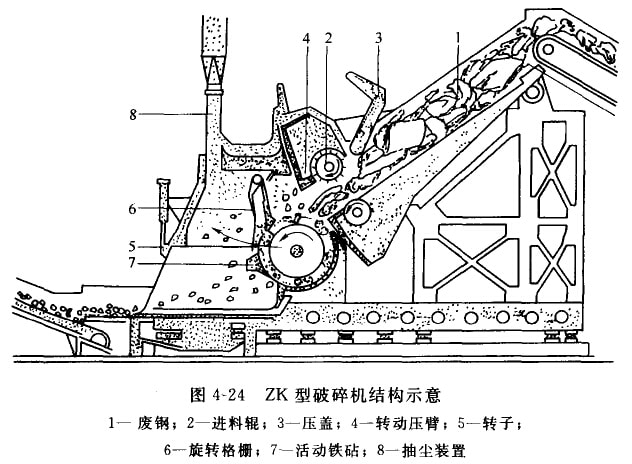 左下方設(shè)有活動鐵砧,可以調(diào)節(jié)轉(zhuǎn)于錘頭勺砧之間的間隙,從而獲得預(yù)期尺寸的破碎鋼片。旋轉(zhuǎn)格柵起到篩和不可破碎物排放門的雙重作用。③轉(zhuǎn)于的旋轉(zhuǎn)方向嶼供料方向一致,物料進入破碎機后,首先是保持在破碎腔上方。可破碎物進入轉(zhuǎn)子與砧之間后被擊破撕裂成小塊,不可破碎物(重型廢鋼)將在轉(zhuǎn)于的驅(qū)動廠撞向活動格柵,使其向后轉(zhuǎn)動,從而離開了破碎機。這是ZK型破碎機的最大特點。ZK型破碎機結(jié)構(gòu)如圖4-24所示,其功率與生產(chǎn)能力如表4-6所示。